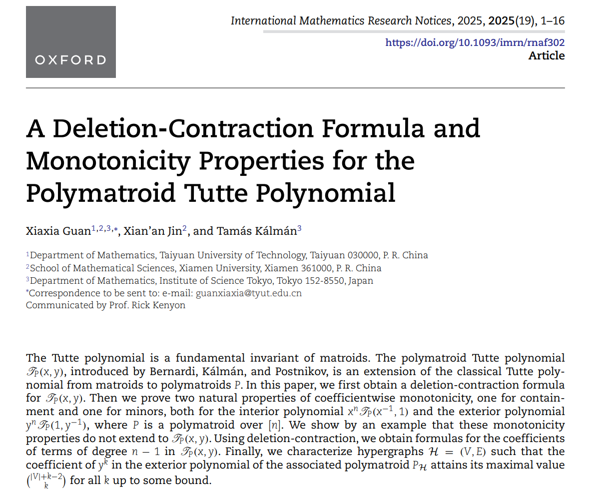 最近,公司英国上市官网365关夏夏博士与厦门大学金贤安教授以及东京科学大学Tamás Kálmán教授合作在国际著名数学期刊《International Mathematics Research Notices》上发表了题为“A deletion-contraction formula and monotonicity properties for the polymatroid Tutte polynomial”的论文。