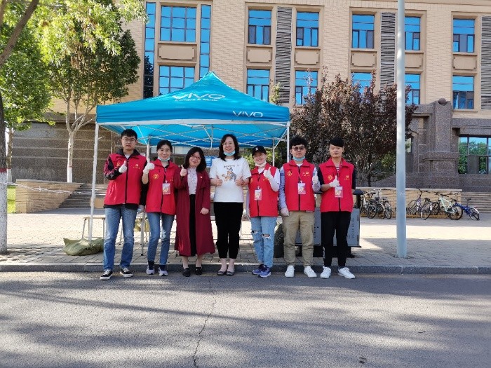 在公司南门,核验组的志愿者们为每一个到来的同学消毒所带行李、检查健康码、测量体温、登记相关信息,并为每一名同学发放公司自主研制的口罩。即使核验组的工作复杂繁琐,但每一位志愿者都带着十二分的热情投入到此次疫情防控工作中来,他们认真负责的工作态度确保了每一位同学的安全,充分体现了一名共产党员的使命感。志愿者刘燕杰分享了他的心得:“夏天的炎热总也比不过志愿者的热心,作为防控疫情的党员先锋队员,今天的工作没有感到丝毫的累,返校同学们的每一句谢谢和在口罩下弯着的嘴角是我们最为有效的去乏药。能作为志愿者来服务各位返校同学是我们应有的自觉和让党旗在防控疫情斗争第一线高高飘扬的行动体现。病毒无情,太理有情,欢迎同学们返校!”