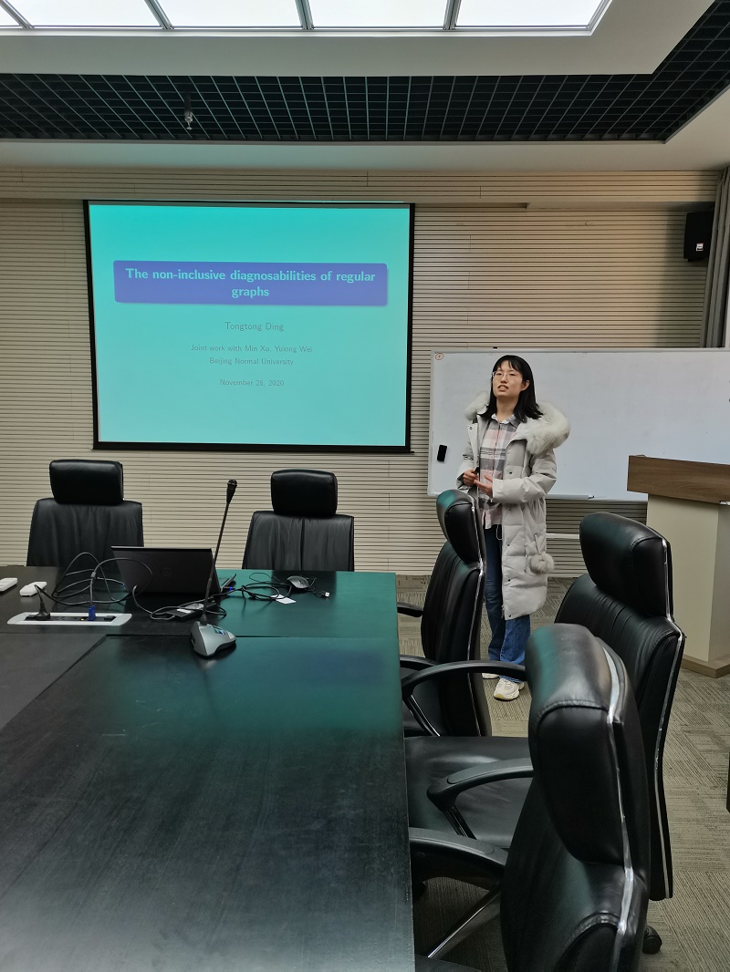 11月28日下午,北京师范大学数学科学公司的博士研究生丁曈曈应邀在英国上市官网365602会议室为公司师生作题为“The non-inclusive diagnosability of regular graphs”的报告。报告由英国上市官网365讲师魏宇龙主持,公司图论与组合网络方向的教师与研究生参加了报告会。