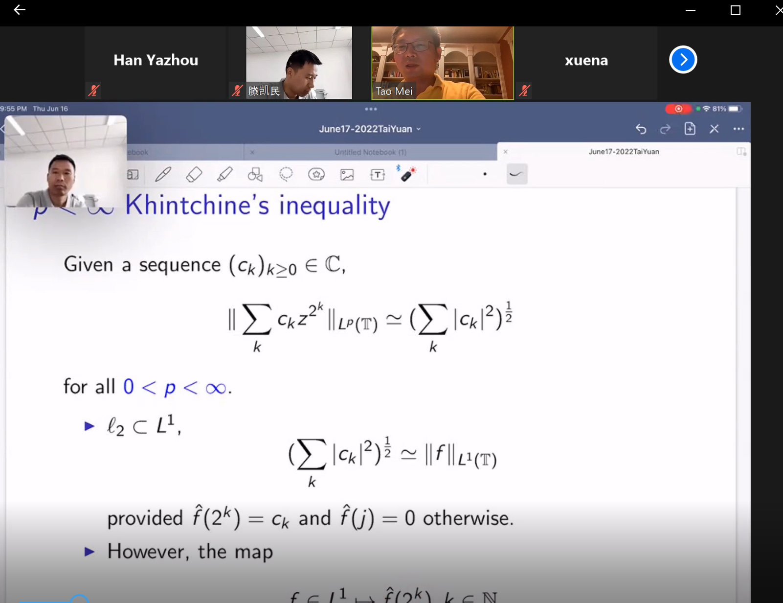 上午10:30,梅韬教授介从经典的Khintchine/Paley不等式出发介绍Paley不等式的发展,最后还介绍了自由群上的Paley不等式的相关结论。报告后,参会师生就相关学术问题与梅韬教授进行了深入的交流,会场气氛热烈。