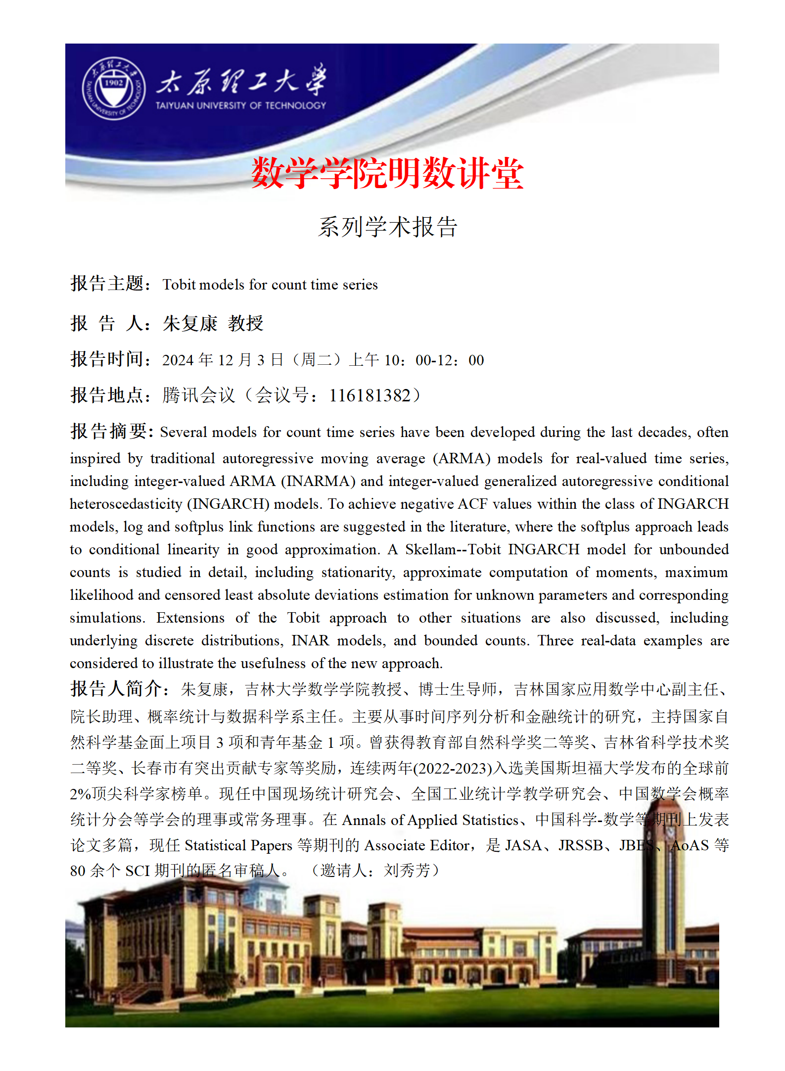 报告人简介:朱复康,吉林大学英国上市官网365教授、博士生导师,吉林国家应用数学中心副主任、经理助理、概率统计与数据科学系主任。主要从事时间序列分析和金融统计的研究,主持国家自然科学基金面上项目3项和青年基金1项。曾获得教育部自然科学奖二等奖、吉林省科学技术奖二等奖、长春市有突出贡献专家等奖励,连续两年(2022-2023)入选美国斯坦福大学发布的全球前2%顶尖科学家榜单。现任中国现场统计研究会、全国工业统计学教学研究会、中国数学会概率统计分会等学会的理事或常务理事。在Annals of Applied Statistics、中国科学-数学等期刊上发表论文多篇,现任Statistical Papers等期刊的Associate Editor,是JASA、JRSSB、JBES、AoAS等80余个SCI期刊的匿名审稿人。