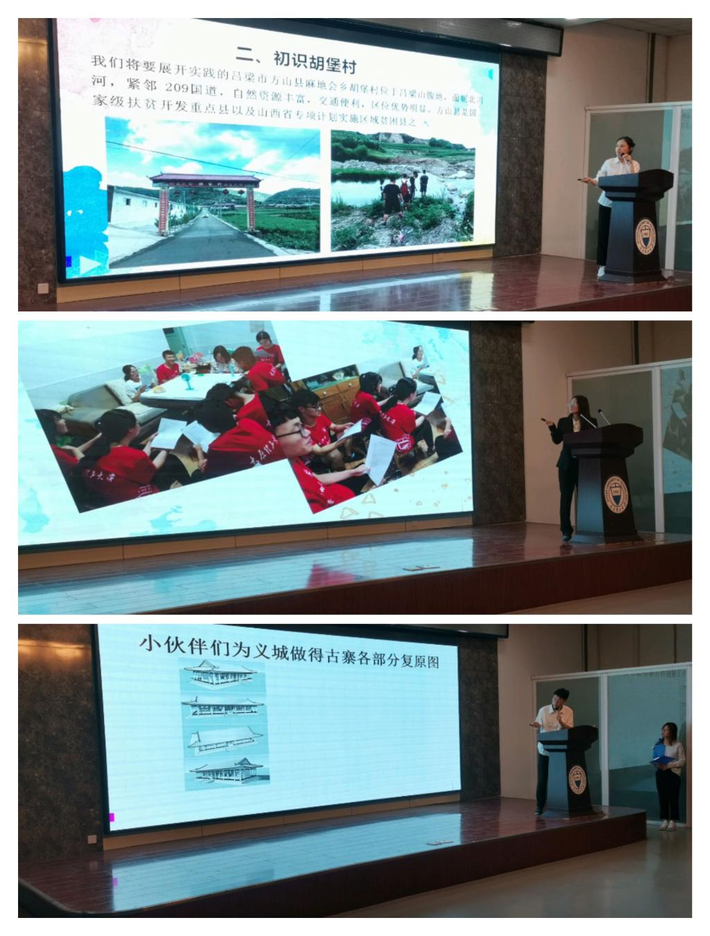 随后,由2019年各暑期“三下乡”集中实践队成员代表分享自己暑期“三下乡”社会实践的经历和收获。参与宣讲的有赴运城夏县社会实践队的代表原一菲、数学建模社会实践队的代表吴成涛、赴晋城实践队代表田宜超以及赴吕梁方山县实践队代表王晴文。他们不仅耐心地向同学们介绍社会实践的过程,还展示了实践期间的精彩瞬间,分享了参与实践调研的经历。