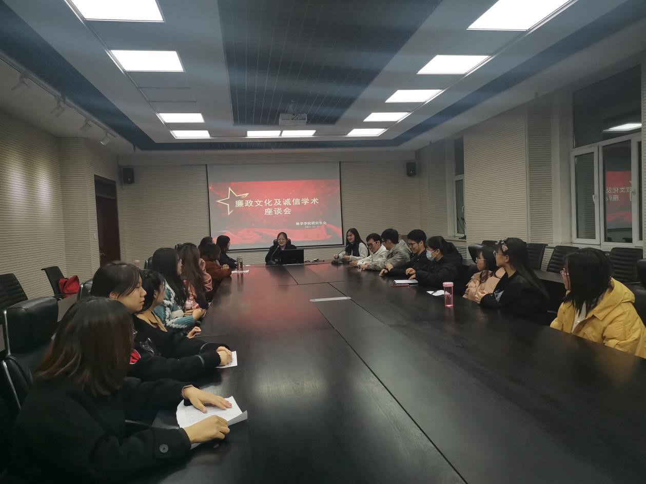 2021年11月11日,公司研究生在数学楼602召开了“廉政文化及诚信学术”交流会”,研究生各班代表参会,会议由研究生会刘慧敏同学主持。
