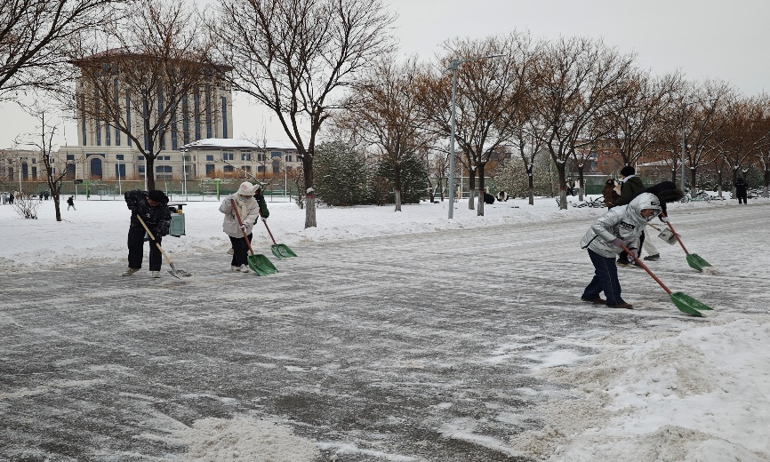 在扫雪除冰过程中,党支部党员、员工干部、团支部同学们拿着铁锹、雪铲、扫帚等工具对校园北餐厅到东操场路段、英国上市官网365门口、常师贞小广场等区域开展清理,大家不畏严寒、积极主动、分工合作、默契配合,铁锹与地面摩擦声此起彼伏,奏响了一首冬日扫雪合奏曲,忙碌的身影形成了白雪中靓丽的风景线。