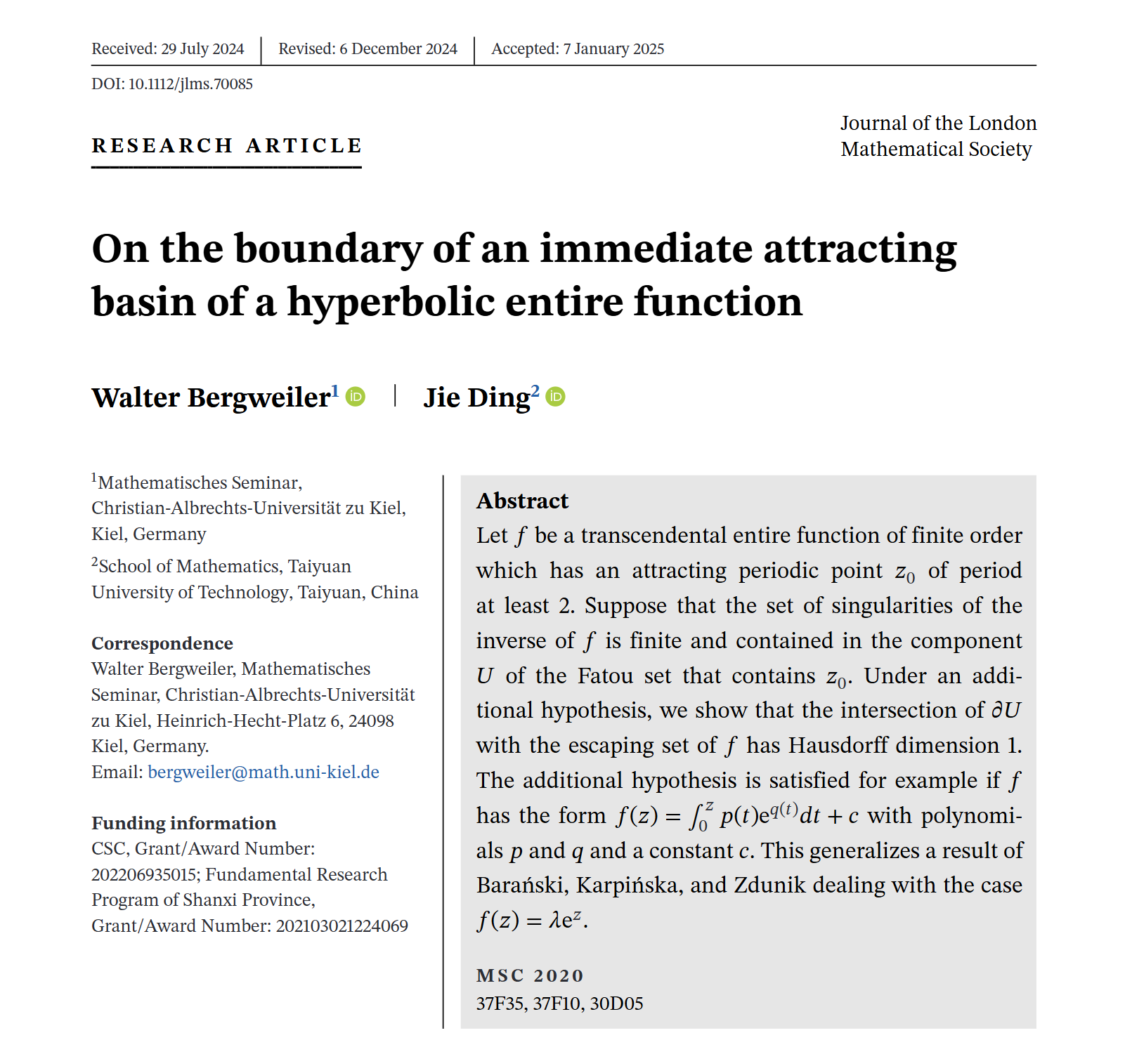 英国上市官网365丁杰副教授与德国数学家Walter Bergweiler教授合作,在超越整函数动力系统领域取得研究进展。研究论文以“On the boundary of an immediate attracting basin of a hyperbolic entire function”为题,发表在数学领域一流国际学术期刊《Journal of the London Mathematical Society》,该期刊是数学领域“四大”期刊之外的最富声誉的国际著名期刊之一。两位合作者以姓氏字母顺序署名发表该文,以姓氏字母顺序署名是数学领域合作发表学术论文的国际惯例,中国数学会也发文呼吁国内单位广泛认同该惯例。